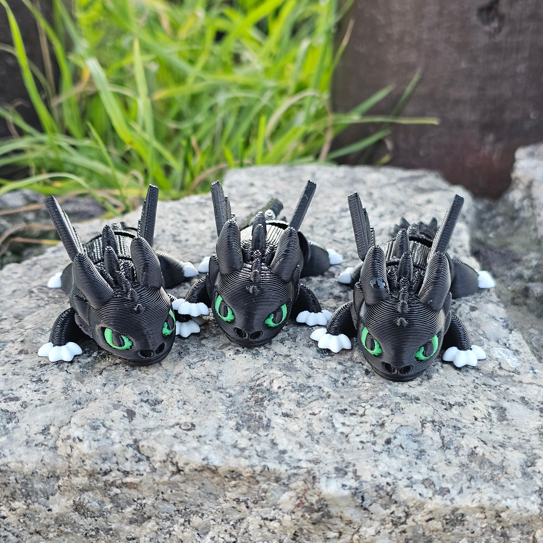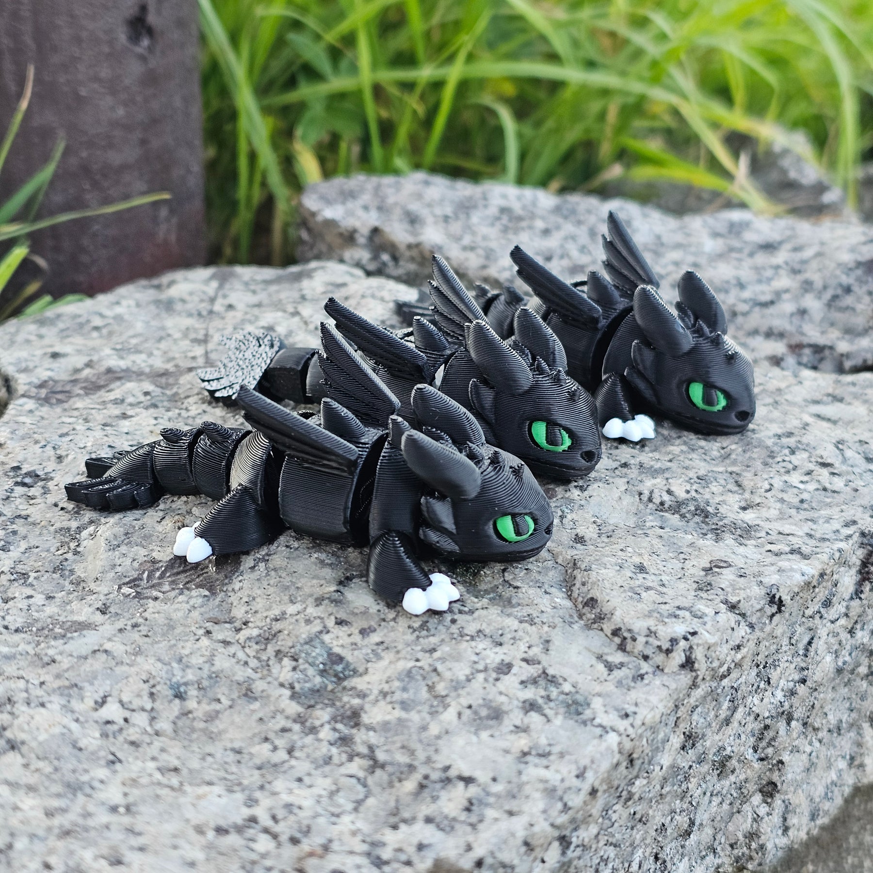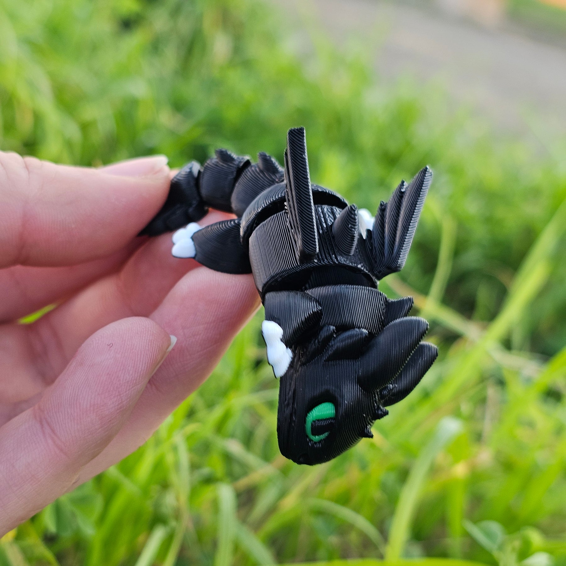 Figura de Chimuelo (Toothless) impresa en 3D, con un diseño articulado tipo. Mide 8 cm y se puede mover fácilmente al tomarlo con la mano: ideal para jugar, decorar o usar como anti-estrés.